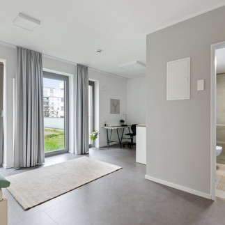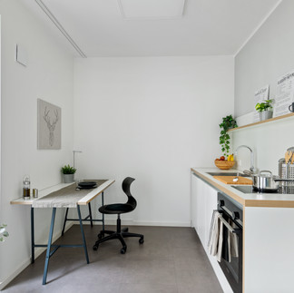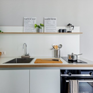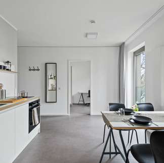 Alle Einheiten sind hochwertig und stilvoll möbliert und verfügen über Einzel- oder Gemeinschaftsküchen mit Induktionsherd, Kühlschrank und Backofen. Im Wohnkomplex stehen zudem hauseigene Wasch- und Trockengelegenheiten, sichere Fahrradstellplätze und Highspeed-Internet zur Verfügung - für alle Mieter inkludiert in einer komfortablen Pauschalmiete.